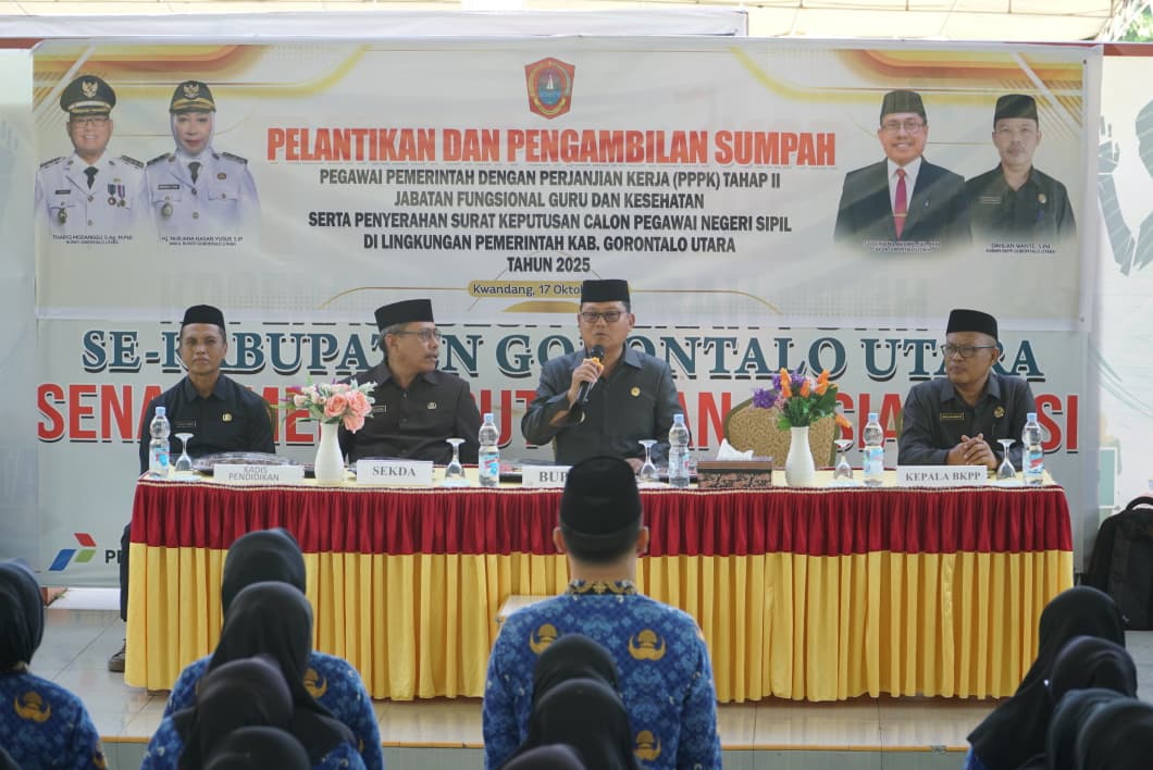 ”Hari ini adalah hari yang bersejarah bagi saudara-saudara sekalian. Setelah melalui proses yang panjang, akhirnya saudara-saudara resmi menjadi bagian dari aparatur sipil negara di Kabupaten Gorontalo Utara,” ujar Bupati Thoriq.