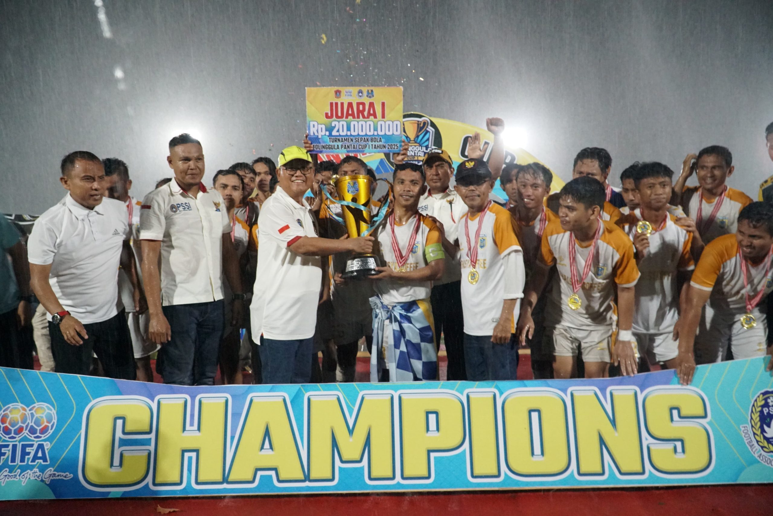 GOLIPUT.ID, Gorontalo Utara – Meski diguyur hujan deras, laga final turnamen sepak bola antar kampung (Tarkam) Tolinggula Pantai Cup I Tahun 2025 berlangsung dramatis di Lapangan Hijau Desa Tolinggula Pantai pada Sabtu (29/11/2025).