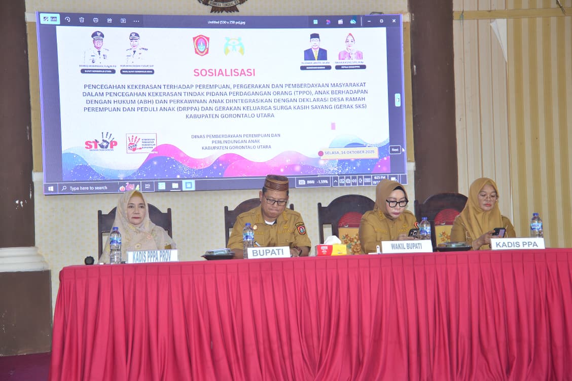GOLIPUT.ID, Gorontalo Utara – Bupati Gorontalo Utara, Thariq Modanggu, membuka secara resmi kegiatan Sosialisasi Kekerasan terhadap Perempuan yang diintegrasikan dengan Desa Ramah Perempuan dan Peduli Anak serta Gerakan Keluarga Surga Kasih Sayang (GK-SKS) tingkat Kabupaten Gorontalo Utara (14/10/2025). Acara yang berlangsung di Aula Germas ini dihadiri oleh Wakil Bupati Nurjanah Hasan Yusuf, Kepala Dinas P3A Provinsi Gorontalo Dr. Yana Satri Sulaiman, S.H., M.H., sejumlah Kepala Dinas, para Camat, dan Kepala Desa dari lima kecamatan.