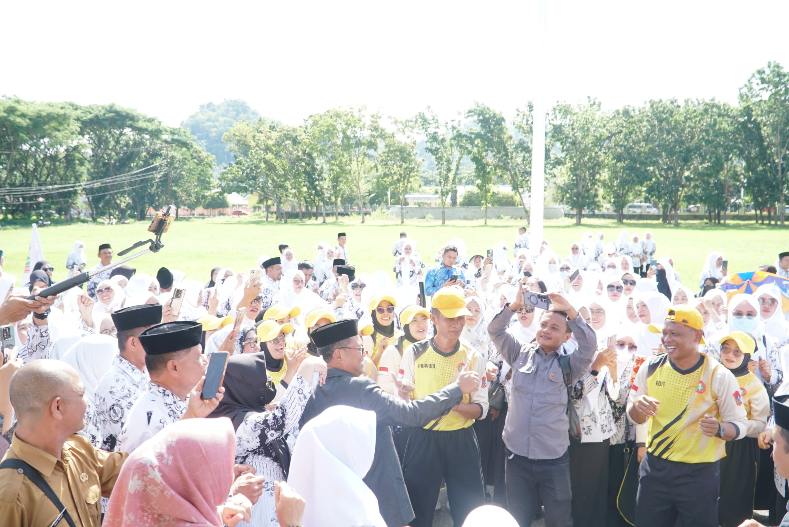 Terlihat Bupati Thariq dan sejumlah guru dan tamu undangan tak kuasa menahan diri untuk bergoyang bersama. Sontak, Thariq pun spontan mengajak seluruh peserta upacara mulai dari guru, jajaran OPD dan tamu undangan untuk merasakan energi yang dihadirkan lagu ini.