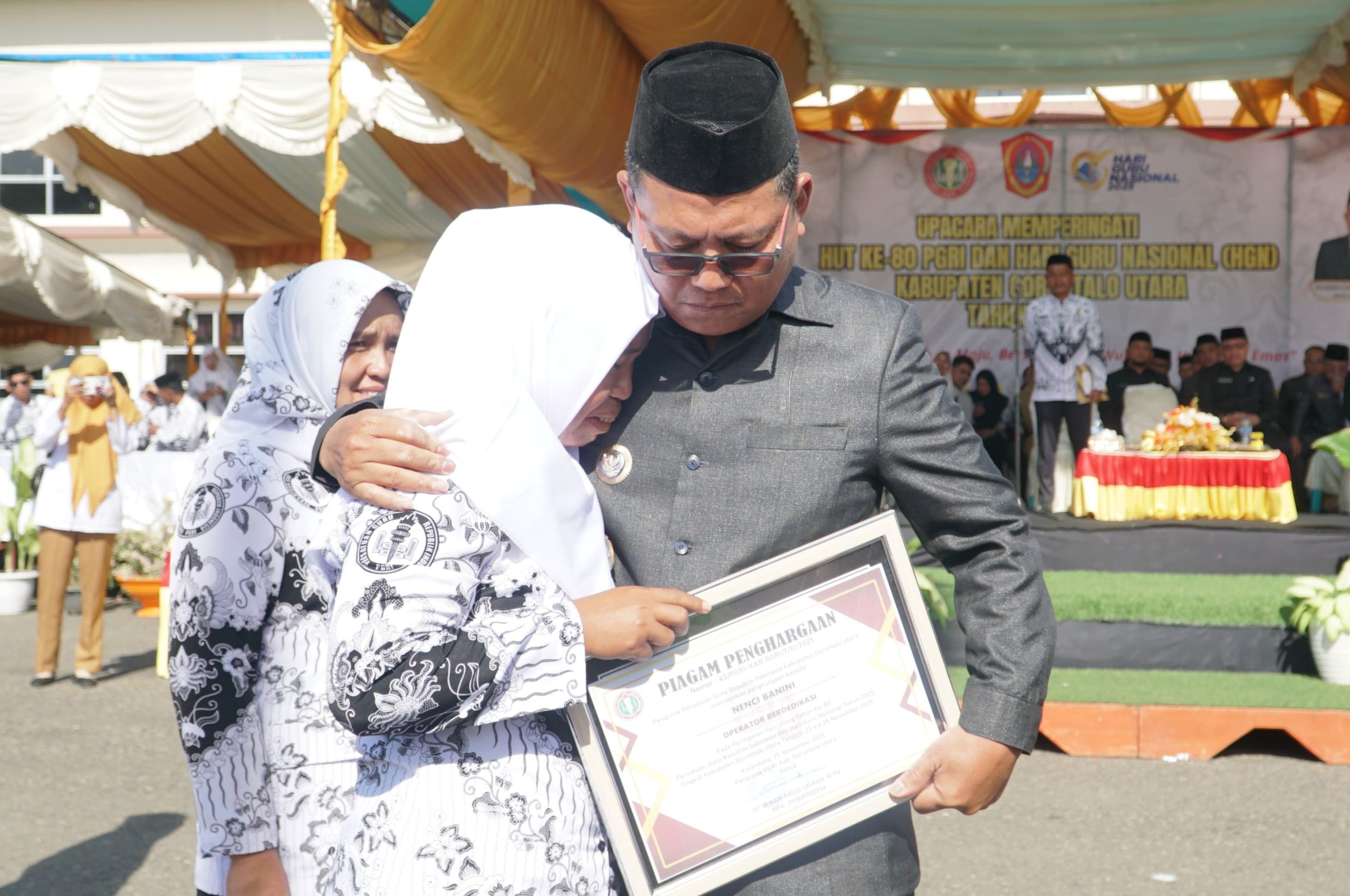 GOLIPUT.ID, Gorontalo Utara– Ditengah hiruk pikuk perayaan Hari Guru Nasional (HGN) dan HUT PGRI, Bupati Grontalo Utara, Thariq Modanggu, mengambil langkah yang mengundang decak kagum. Dalam sebuah keputusan yang disebut sebagai wujud nyata kepedulian “akar rumput,” Bupati Thariq memutuskan untuk menanggung gaji seorang guru honorer, Nenci Banini (SDN 7 Biau), menggunakan dana pribadinya!